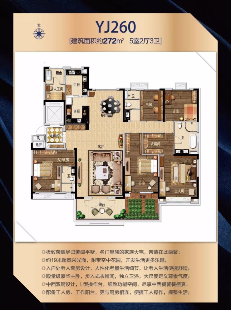 碧桂园·翡丽公馆YJ260建面约272㎡的奢华平墅,拥有完善功能空间的平层住宅。大平层是把别墅的的功能区都放在一个平面上,在一层内解决了家庭生活的所有功能,避免了中老年人频繁上下楼的不方便。同时,大平层宽敞的空间布局能让主卧、客厅等的空间感被强化,并且在舒适度上更加贴合高端人群需求。