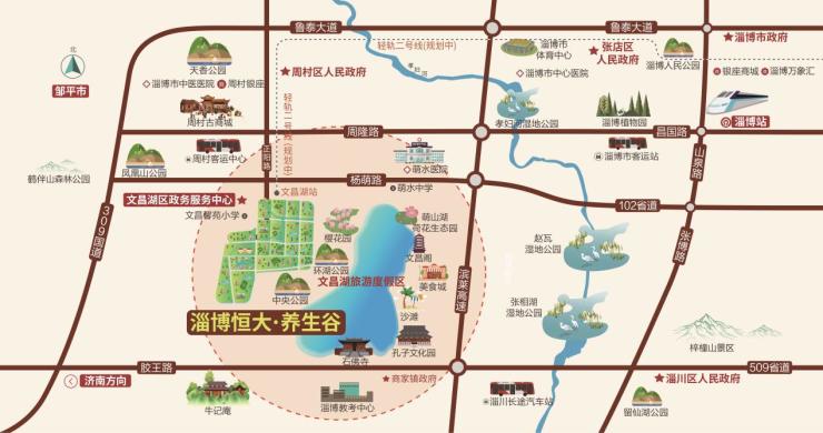 据了解,淄博恒大养生谷选址文昌湖省级旅游度假区,坐拥6800亩环湖公园、3500亩萌山公园、1450亩范阳河湿地公园、950亩绿苑花海、210亩樱花园、1公里滨湖沙滩、荷花生态园、都市农业生态博览园、沿岸经济林果园等景观资源丰富,区内有萌山文昌阁、无极殿、石佛寺、孔子文化创意园等旅游景点。