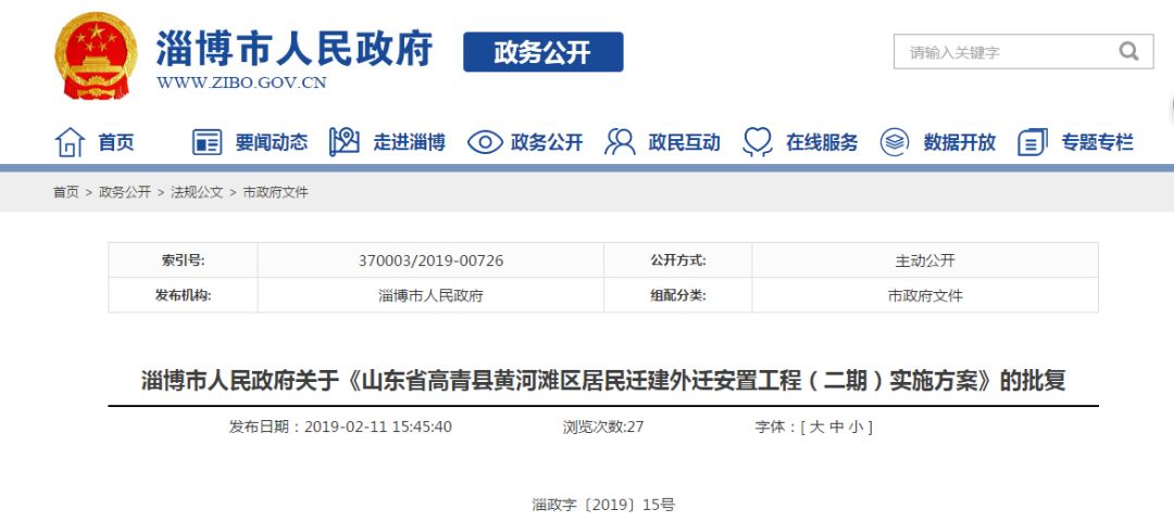 2月11日,淄博市人民政府关于《山东省高青县黄河滩区居民迁建外迁安置工程(二期)实施方案》的批复公布。其中,外迁安置工程(二期)涉及黑里寨镇、木李镇2个镇4个村,安置群众总计334户,1278人。
